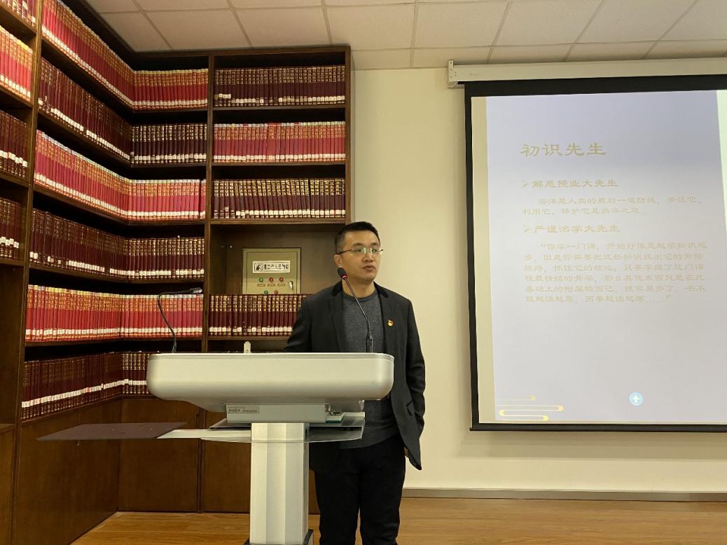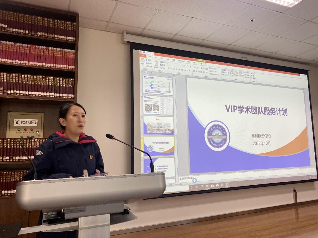 图书馆党总支第一支部孙玉,介绍了图书馆开展的“VIP学术团队服务计划”提供的个性化、精准化、集成化与即时性的学科服务为教师科研过程保驾护航,为教师发展提供支持,并推荐了两个可供教师跟踪科技前沿的“小妙招”。