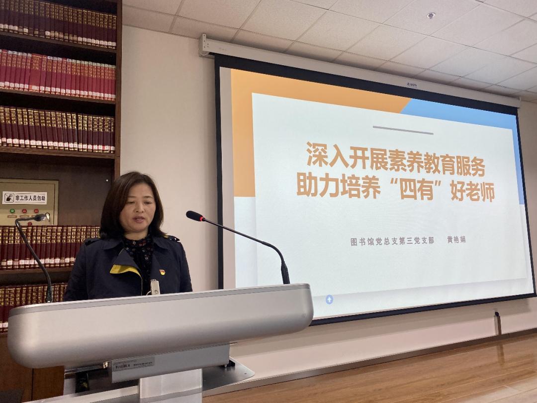 图书馆党总支第三支部黄艳娟,围绕阅读推广赋能教师成长、传统文化助力师德修养进行发言。黄艳娟介绍了读书沙龙和阅读马拉松等图书馆开展的适合教师参与的阅读推广项目,并介绍了深受教师欢迎的插花、茶文化体验活动。