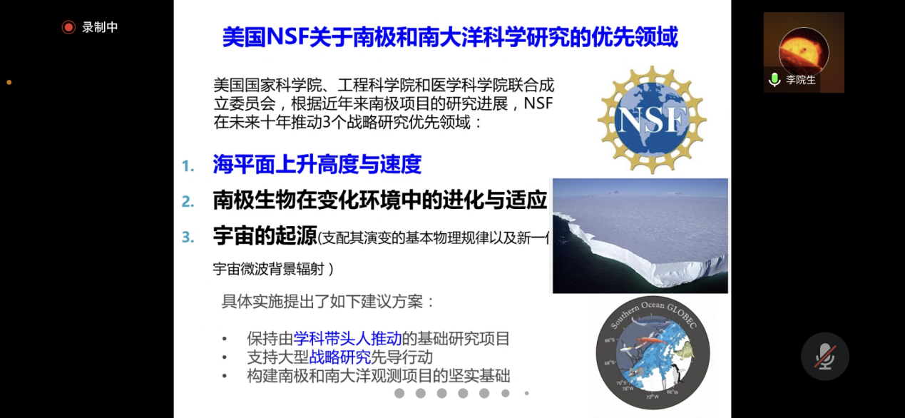 本次讲座的主题为南极冰盖冰芯研究和深冰探测前沿及动态。李院生研究员对南极大陆与冰盖进行了详细的介绍,阐述了南极科学6大优先领域与南极雪冰有直接关系。南极冰盖冰芯是重要的地球气候记录载体,具有高保真度、高分辨率、长周期的特点。特别是冰盖冰芯保存着过去地球大气的样品,这是其他气候记录载体所没有的。本报告主要介绍南极冰盖的概况、南极冰盖冰芯气候记录研究的新进展、冰芯科学主要成果和围绕寻找古老冰芯为核心的新一轮深冰芯钻探以及南极冰盖深冰探测若干重要方面,介绍我国深冰芯钻机以及昆仑站深冰芯钻探进展等。