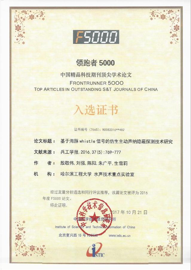 近期,中国科学技术信息研究所公布了2017年度中国科技论文与引文数据库(CSTPCD)统计结果和2017年度“领跑者5000——中国精品科技期刊顶尖学术论文”(F5000)名录中,公司殷敬伟教授的论文《基于海豚 whistle信号的仿生主动声纳隐蔽探测技术研究》入选。