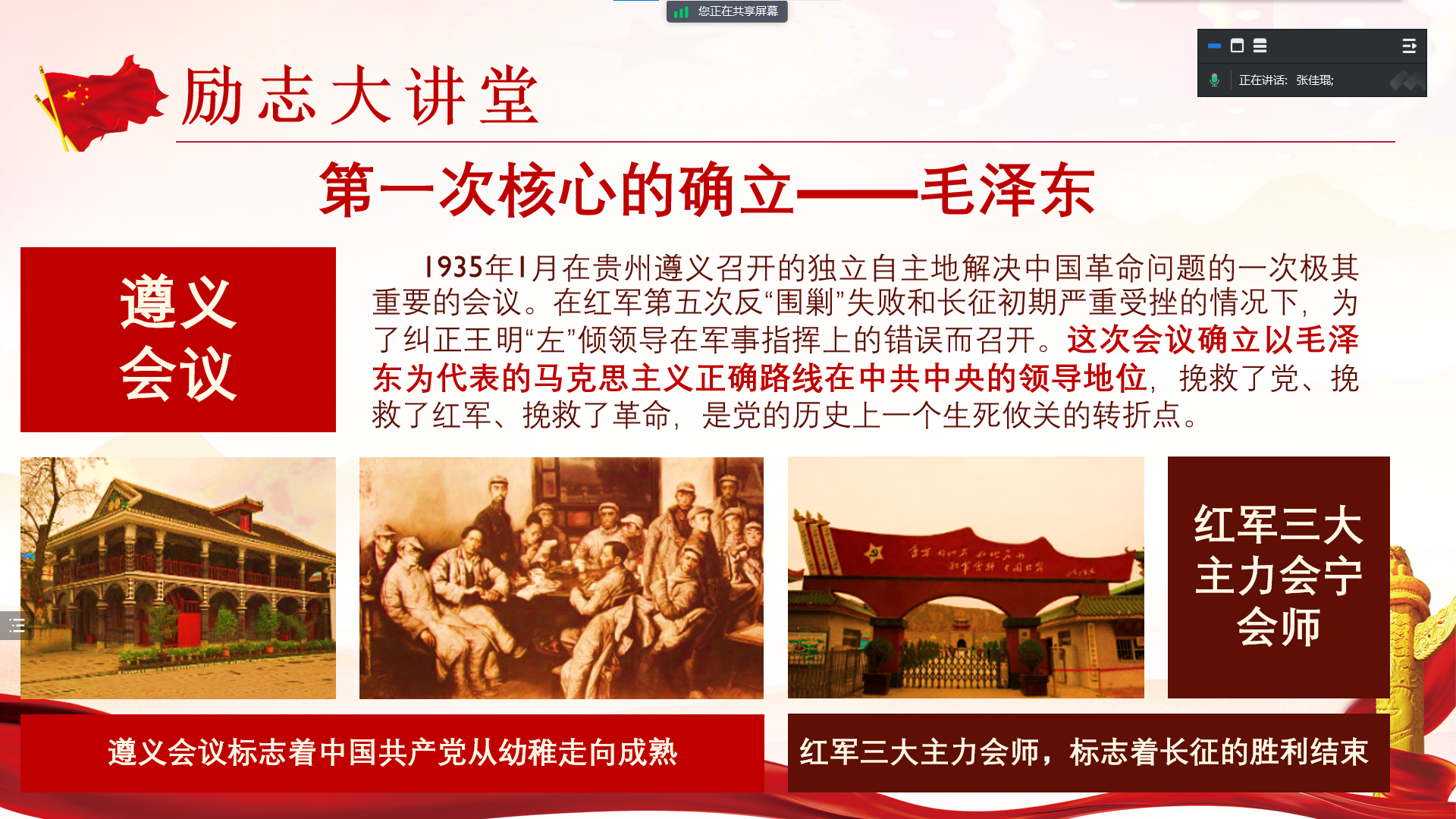 张佳琨结合新民主主义革命时期的重大节点发生的故事,讲述了党的第一次核心确立。他着重强调遵义会议的历史地位。通过对遵义会议的背景和意义的描述,突出了遵义会议的重要影响。借助对长征历程的讲解,表明中国红军就是我国捍卫和平与发展的钢铁长城。