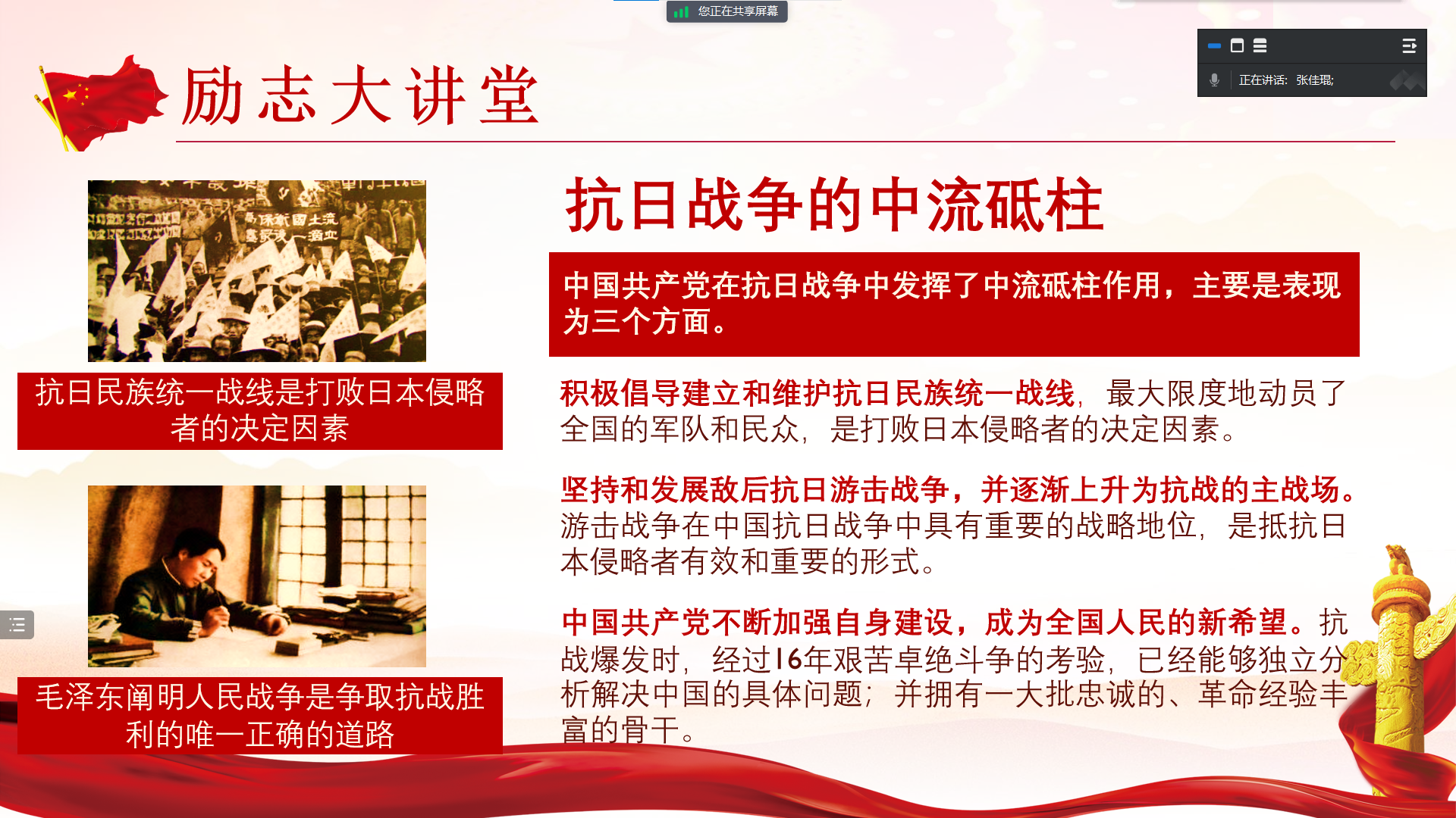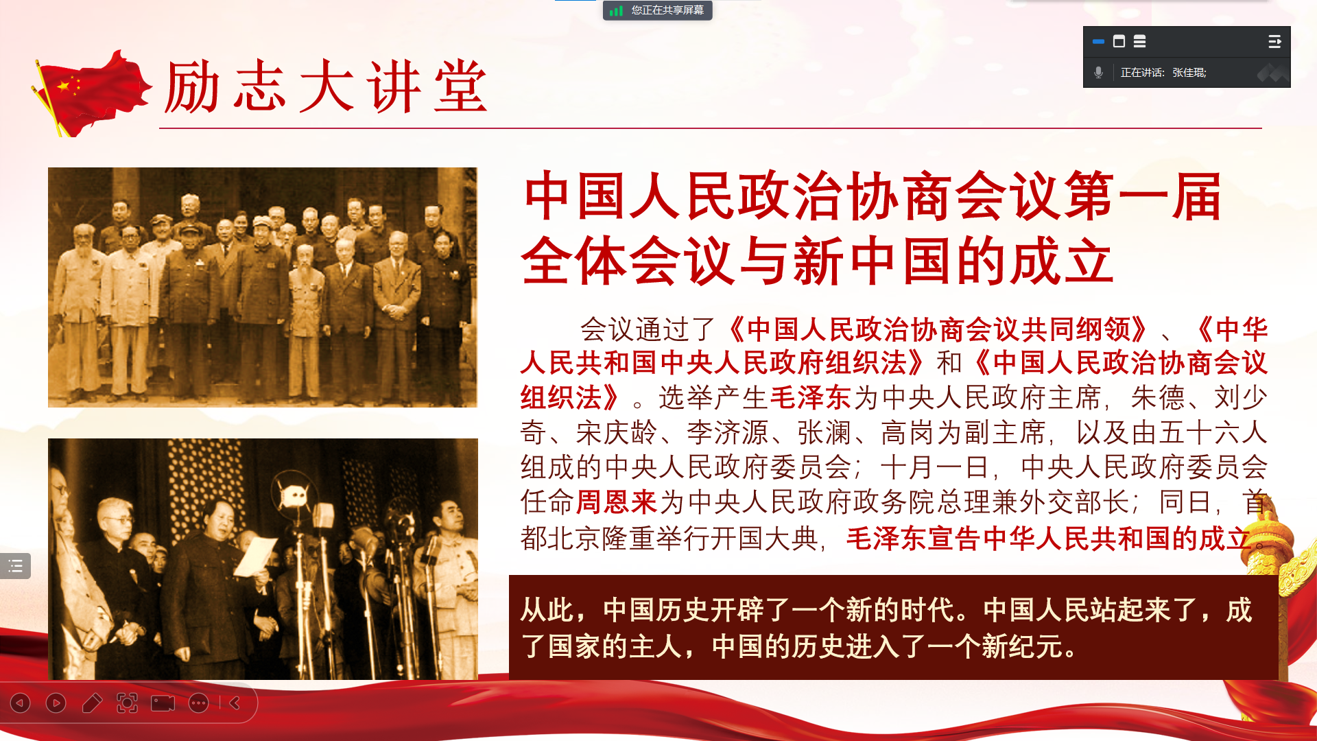 张佳琨从党的第一次核心的确立、抗日战争的中流砥柱、第一次政协会议的开展三个方面向同学们展开对党的历史的介绍,让同学们更加清晰地认识到党的发展历程与艰苦奋斗的精神。