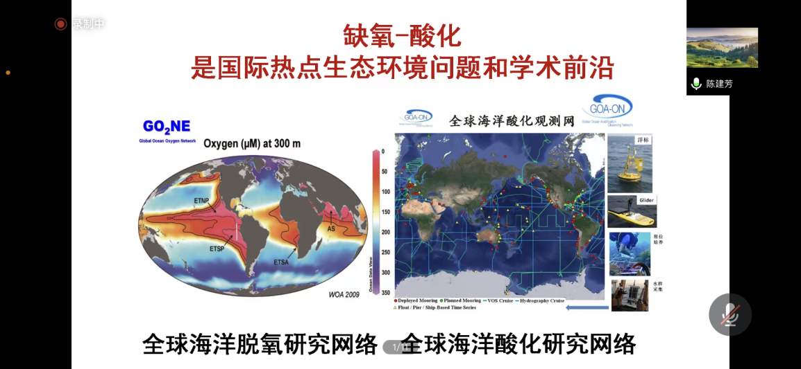 陈建芳研究员分别从海洋缺氧酸化现象及如何应对缺氧酸化两个部分展开讲解。由于气候变化和人类活动的叠加影响,海洋缺氧和酸化成为日益严重的全球性生态环境问题。如同人不能没有氧气一样,缺氧直接关系到海洋生物的存活。严重的缺氧事件,可以导致整个海洋生态系统的崩溃。海洋酸化既由海洋吸收了人类排放的CO2引起,而且与近海富营养化有关,海洋酸化可以影响珊瑚、贝类的钙化率,进而影响海洋生物的生态生理过程。目前,海洋缺氧、酸化已在国际上受到包括科学家、政策制定者、管理者等的广泛和持续关注,国际上先后成立了全球海洋溶解氧网络(GO2NE)和全球海洋酸化观测计划(GOA-ON)。