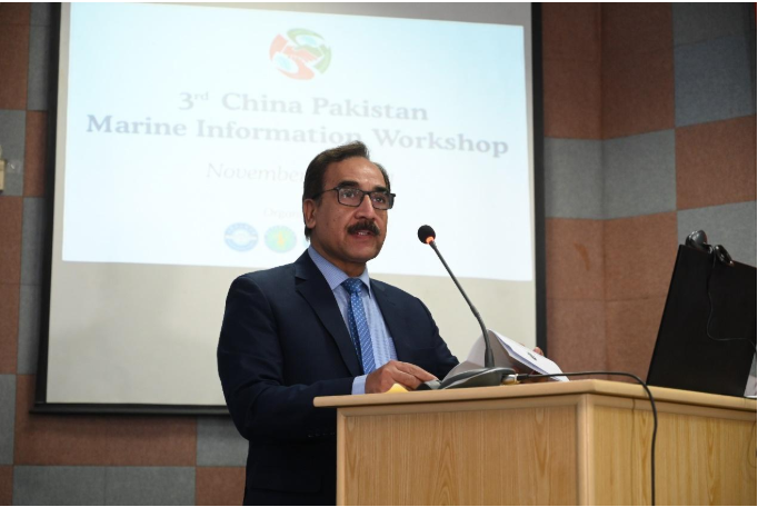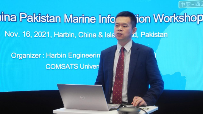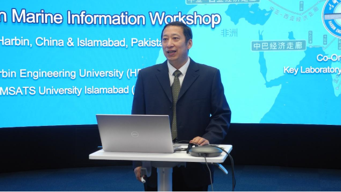 殷敬伟在致辞,他简要介绍了公司的历史沿革等情况,希望公司与巴基斯坦相关科研院所的专家学者开拓进取,精诚合作,并肩前行,越来越多的青年学者投身于海洋信息新兴领域工作,携手共建海洋信息创新平台,巩固合作基础,挖掘合作潜能,不断取得新成就,共创全球海洋科技新辉煌。