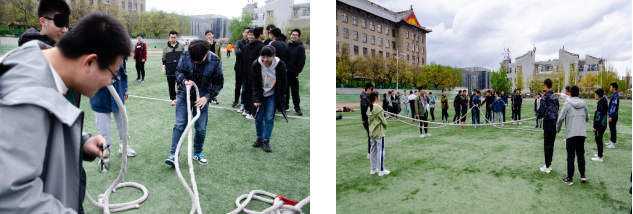 在黑夜协作中,部分同学被遮住眼睛完成任务,另一部分同学则作为其他同学的眼睛,负责指挥他们共同完成工作。同学们体会到了黑夜探索的艰难,也意识到了正确指挥的重要性,这也象征着在党的正确领导下,突破重重阻碍,不断取得胜利的过程。