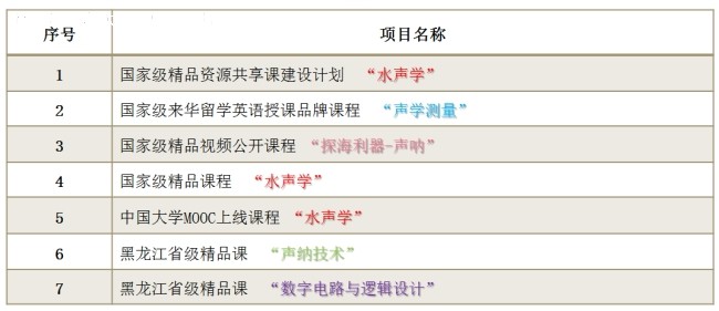 水声工程实验教学中心创新团队简介 一、整体水平 团队成员以教学科研一线教师为骨干,以国防特色专业“水声工程”为研究核心,团队凝聚力强,整体水平高。平均教龄15.8年;具有丰富的教学研究与改革实践经历,完成教改项目 56 项,获得教学奖励 16 项,发表教学研究论文 23 篇。团队成员具有高度的责任感,为团队目标献计献策,勇于创新,积极向上,具有创新和学习能力,有未来发展目标和远景规划。 二、课程建设 4门国家级精品课程,2门省级精品课,1 门MOOC上线课程。