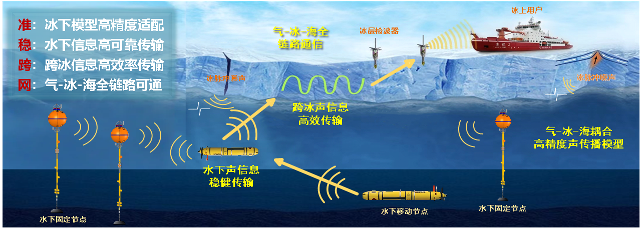 项目面向极地立体观监测平台信息传输需求,针对现有水声通信理论和方法在极地环境应用面临的模型适配差、信息通不稳、跨冰传输难、立体联通弱等难题,建立了高精度冰下声传播模型,发明了冰致强脉冲噪声抑制与稳健通信技术,提出了跨冰声信息传输方法,构建了极地复杂声场环境下的稳健跨域声信息传输系统,使我国具备了“准、稳、跨、网”的极地信息传输能力。